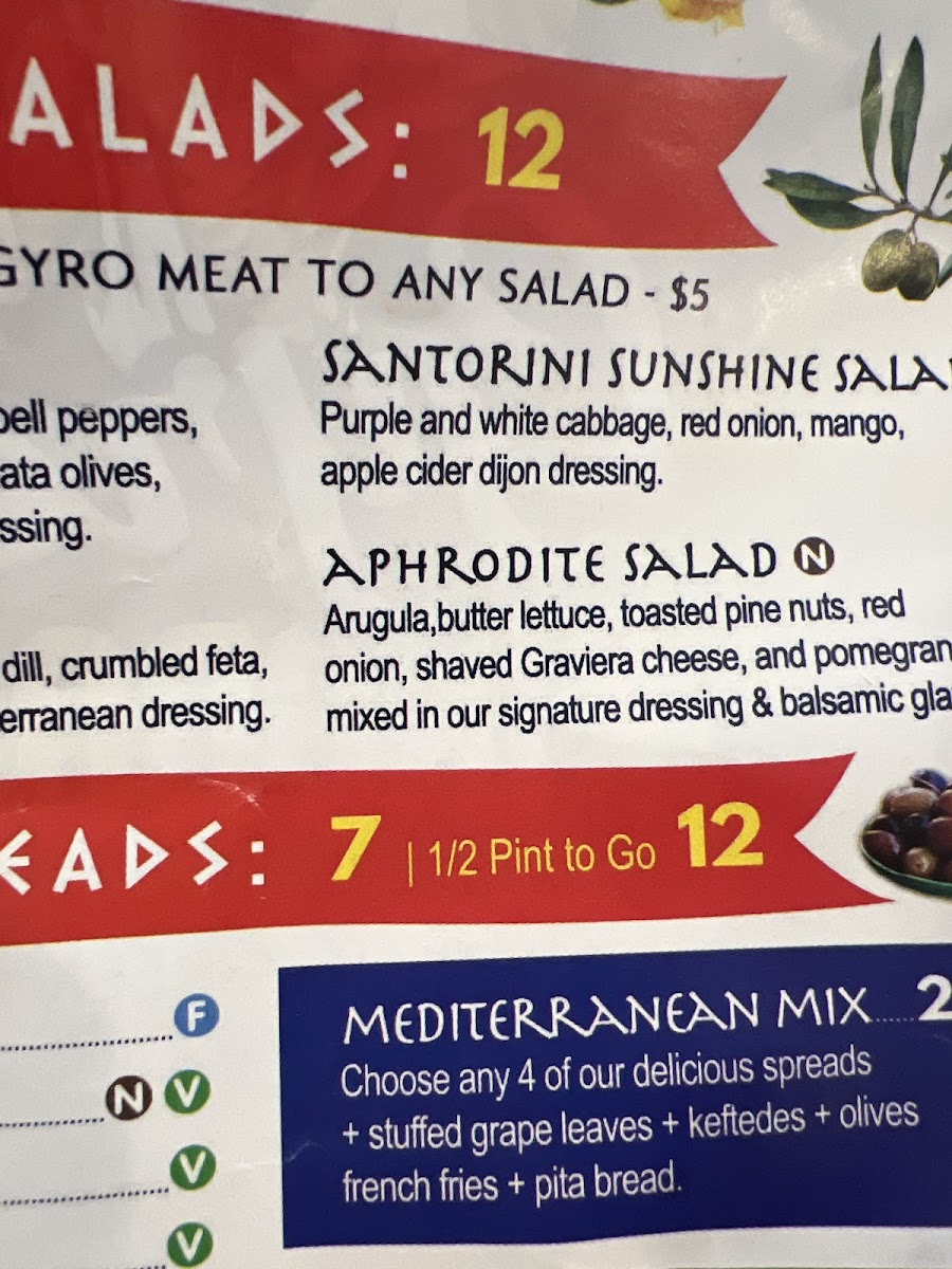 Salad lovers can enjoy fresh options such as the classic Greek Salad, the vibrant Santorini Sunshine Salad, or the crisp Marouli Salad Aphrodite Salad. For a hot beverage or a caffeine kick, you can choose from Greek Coffee, American Coffee, or the icy delight of Frappe.